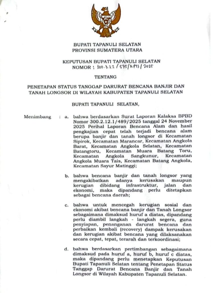 Tapanuli Selatan – Pemerintah Kabupaten Tapanuli Selatan (Tapsel) resmi menetapkan status tanggap darurat bencana banjir dan tanah longsor yang melanda sejumlah wilayah. Penetapan ini tertuang dalam Keputusan Bupati Tapanuli Selatan Nomor: 100.3.3.2/575/KPTS/2025, yang ditandatangani pada 25 November 2025 di Sipirok.